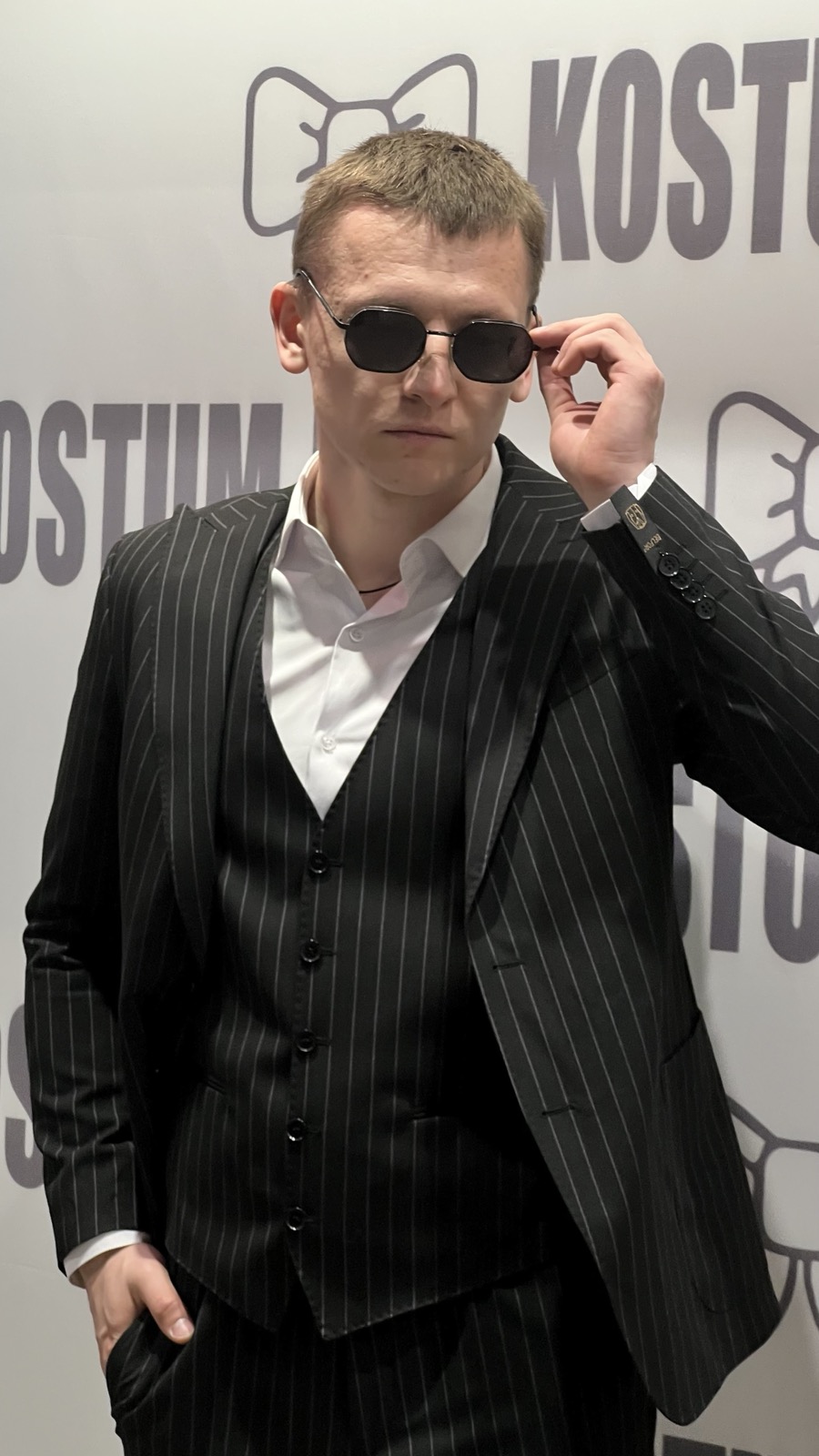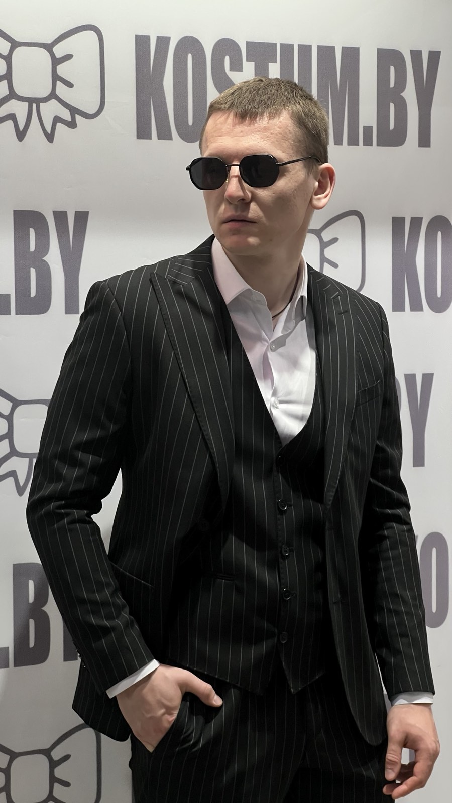 Черный костюм в светлую полоску — тренд 2025–2026 для стильного жениха. Элегантный силуэт, благородная ткань (80% шерсть, 18% вискоза, 2% эластан) обеспечивают идеальную посадку и комфорт в любой сезон. Идеальный выбор